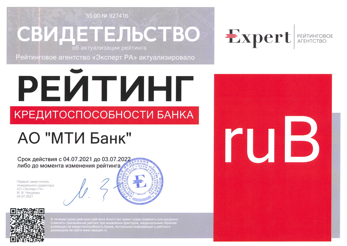 11 июня 2021 года рейтинговое агентство «Эксперт РА» подтвердило рейтинг кредитоспособности МТИ Банку на уровне ruB. По рейтингу сохранен стабильный прогноз.