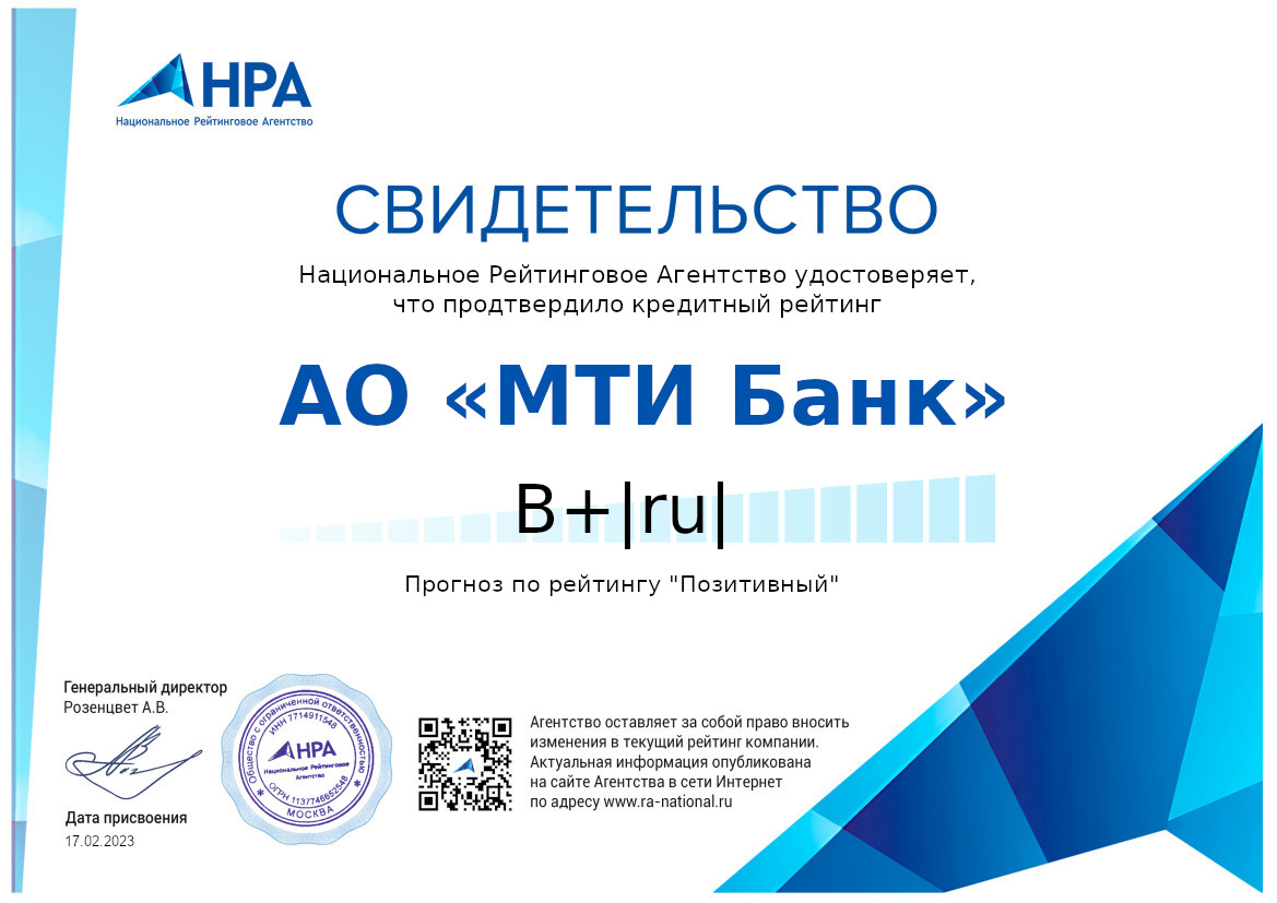 21 февраля 2023 года Национальное Рейтинговое Агентство (НРА) подтвердило кредитный рейтинг АО «МТИ Банк» на уровне «В+|ru|» по национальной рейтинговой шкале для Российской Федерации, изменив прогноз по рейтингу на «позитивный».